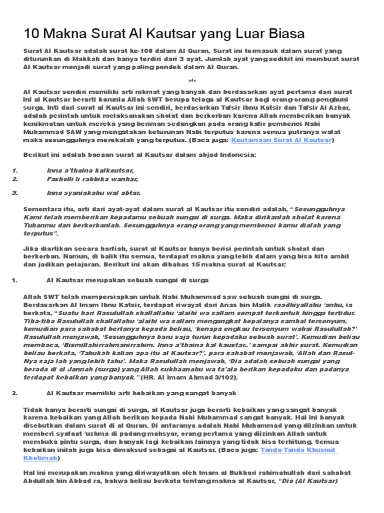 Sesungguhnya kami telah membagikan kepadamu suatu sungai. Diberi nama al arti bahasa indonesia qs al kautsar. Dengan memberinya kabaikan yang banyak. Diturunkan di mekah, surat ini terdiri dari 3 ayat dan terpendek dalam al quran. Berupa keturunan yang sangat banyak.