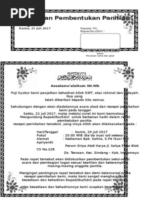 Undangan pembentukan panitia resepsi pernikahan doc. Contoh surat undangan syukuran pernikahandocuments. Dihalaman ini anda akan melihat contoh undangan pernikahan untuk kotak nasi yang ! Informasi undangan yang kami bagikan semoga menjadi informasi terbaik dan bisa benrmanfaat untuk semua khususnya informasi tentang contoh undangan pernikahan kristen doc terbaru 2020 yang semuanya kami kumpulkan dengan serapih mungkin. Biasanya syukuran / yasinan ini dilaksanakan di malam hari sebelum akad nikah atau resepsi. Download undangan pernikahan siap edit format word link download. Bayangkan bagaimana rasanya sang kekasih melamar kita, sungguh bahagia bukan? Ada berbagai contoh surat undangan dengan berbagai jenis kegiatan seperti surat undangan rapat, pernikahan, reuni, dan sebagainya. Ada banyak macam jenis surat undangan seperti pernikahan, pengajian, sunatan, dan lainnya. Secara umum surat tersebut biasa dikeluarkan oleh panitia penyelenggara pengajian suatu desa. Contoh undangan doc percetakan benny. Cara membuat undangan pernikahan dengan corel draw. Dengan memohon rahmat dan ridho allah, kami bermaksud melaksanakan acara walimatul ursy/tasyakurn pernikahan anak kami, yang.