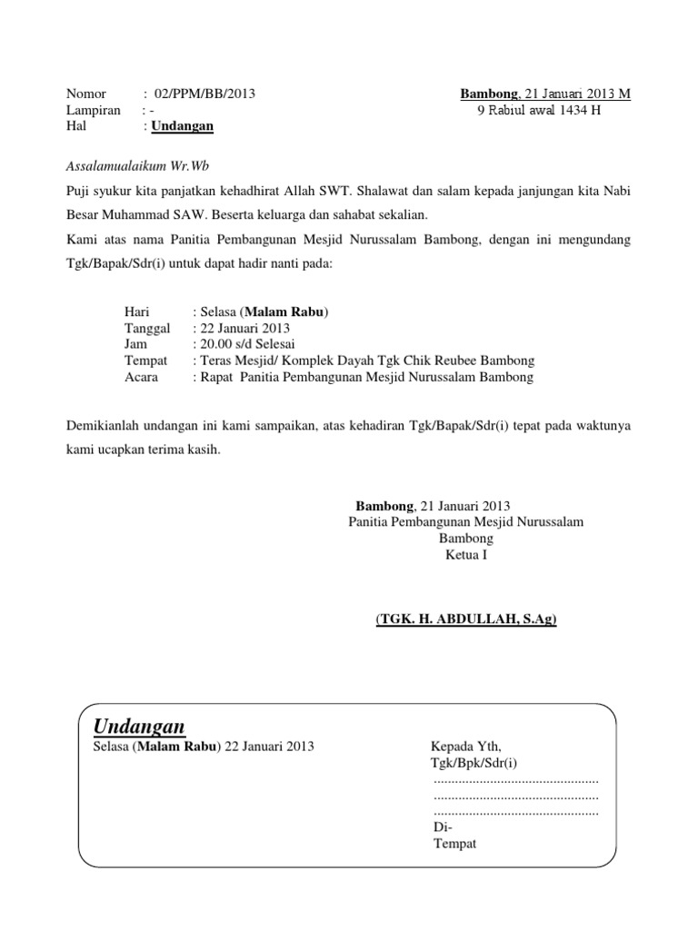 Pengurus karang taruna bhakti jaya desa kresek kec. Bapak/ibu pengrus masjid nurul amin. Surat undangan sendiri terdiri dari surat undangan resmi dan surat undangan tidak resmi. Dengan mengetahui contoh surat undangan rapat,pastinya anda tidak akan kesusahan saat ingin mengumpulkan beberapa rekan kerja. Ada berbagai contoh surat undangan dengan berbagai jenis kegiatan seperti surat undangan rapat, pernikahan, reuni, dan sebagainya.